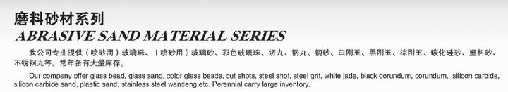我工廠供給(噴砂(sha)用(yong))的(de)夾絲(si)有(you)機玻(bo)(bo)璃(li)珠、(噴砂(sha)用(yong))的(de)夾絲(si)有(you)機玻(bo)(bo)璃(li)砂(sha)、色彩的(de)夾絲(si)有(you)機玻(bo)(bo)璃(li)珠、切(qie)丸、鋼(gang)丸、鋼(gang)砂(sha)、白剛玉、黑剛玉、棕(zong)剛玉、無定形碳(tan)硅砂(sha)、塑膠片砂(sha)、不(bu)透鋼(gang)丸等。十幾(ji)年常備許多貨(huo)存。