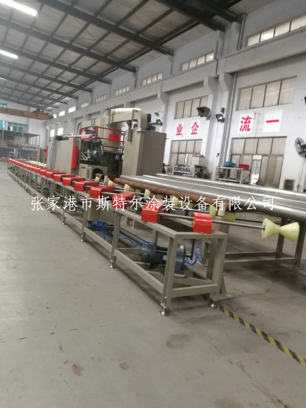 本套設備為管道自動噴砂機,由噴砂室、上料架、旋轉輸送、噴槍移動和高度調節、下料架、砂塵分離、儲料箱、除塵器及控制等幾部分組成,加工過程中管道一邊移動一邊旋轉,在噴砂區域設置移動噴砂槍32套,即可實現管道外壁的全覆蓋。整套設備采用全自動控制。為延長設備的維護周期,在主機內部斜斗處,安裝10mm耐磨板;噴砂設備采用全自動回收裝置,提升機快速回收沙料裝置,有效的無死角回收,全程監控防跑偏裝置,提高噴砂機設備的穩定性。除塵機采用防堵死專用濾筒,自動脈沖控制儀,按照不同的工礦環境設置時間。有效提高使用壽命及環保要求。該自動噴砂機配備的防滑托輥,能夠快速的將工件輸送的工作倉,并且使用壽命達到3-5年以上,為客戶在噴砂進行中的穩定性保駕護航。得到客戶的充分肯定。
